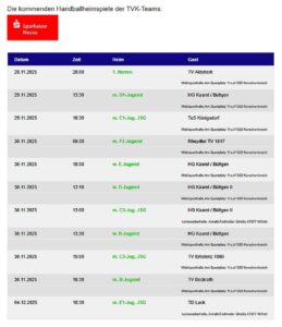 Die Erste spielt bereits am Freitag im Niederrheinderby der Regionalliga um 20.00 in der Waldsporthalle gegen den TV Aldekerk. Für die 700 Zuschauer fassende Waldsporthalle sind noch ca 100 Tickets verfügbar. Die Abendkasse öffnet ab 18.30 Uhr.