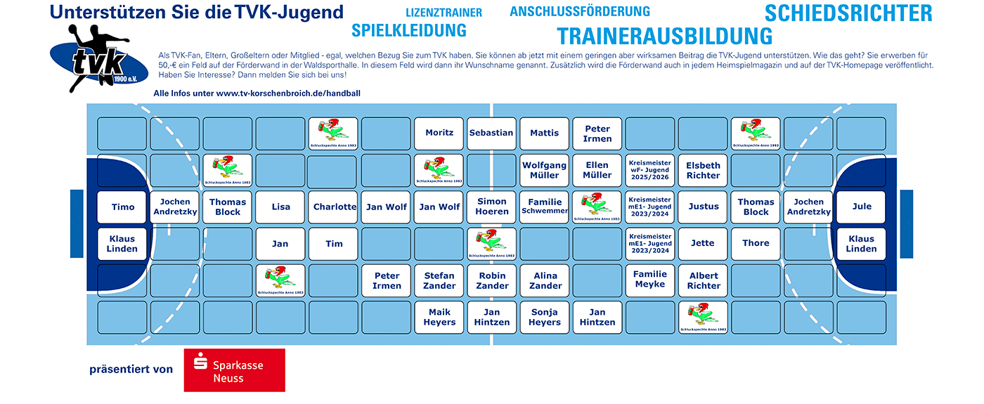 Für je 50€ pro Jahr reservieren wir Ihnen jeweils ein Feld auf unserer Förderpool-Wand in der Waldsporthalle, auf unserer Webseite und in jedem Heimspielheft “TVK inside” unserer 1. Herrenmannschaft..