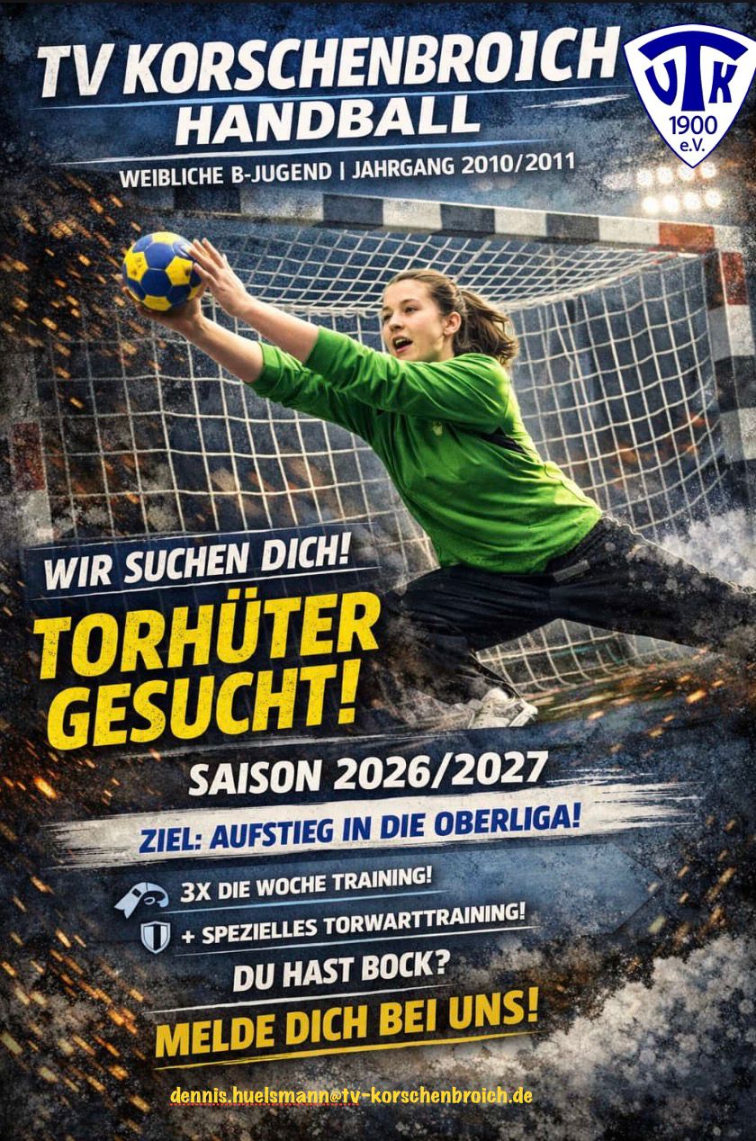 Der TV Korschenbroich sucht für die Saison 2026/27 Verstärkung für die weibliche B-Jugend (Jahrgänge 2010/2011). Besonders im Tor, aber auch auf dem Feld.