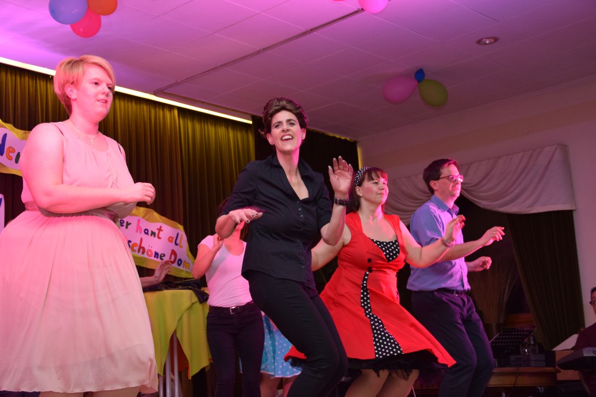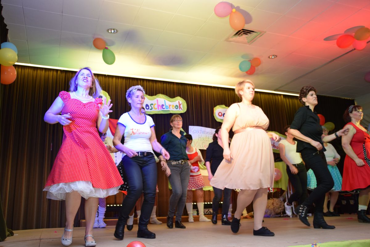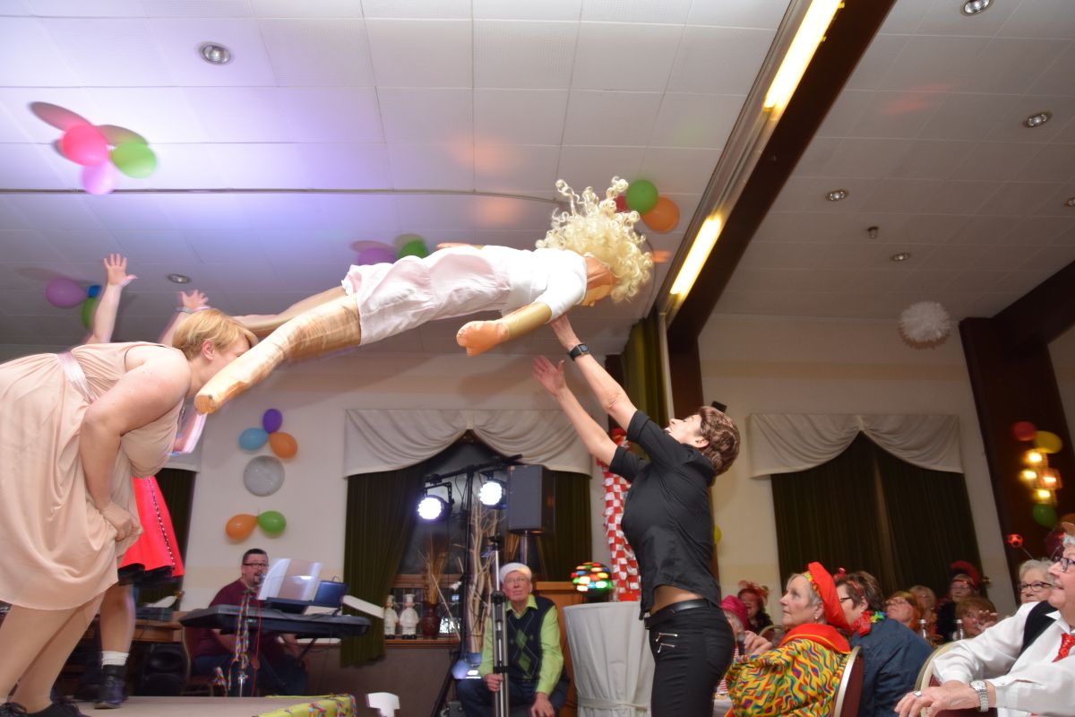 Erkannt wurden die Breitensportler natürlich trotzdem. Aber ob vor, hinter oder auf der Bühne – allen hat es sichtlich Spaß gemacht. Die Auftritte waren ein voller Erfolg und wurden vom Publikum gefeiert. Nachdem Marc Venten nicht nur die Wanne mit seinem komödiantischen Talent eingeheizt hatte, tanzte sich “Hulapalu” in Dirndl und Lederhosen wie von selbst. Und auch im Breitensport-Finale, der Korschenbroicher Dirty-Dancing-Version, blieben keine Wünsche offen: Kreisende Hüften, schmachtende Blicke, Baby im rosaroten Kleidchen und selbstverständlich die berühmte Hebefigur. Über letzteres wurde sich besonders amüsiert, oder anderes gesagt, die fliegende Puppe aus Schwimmnudeln und Verpackungsmaterial, ließ nicht nur die ersten Zuschauerreihen aufkreischen, auch wenn sie sich nach ihrem Flug erst einmal dort gemütlich machte.